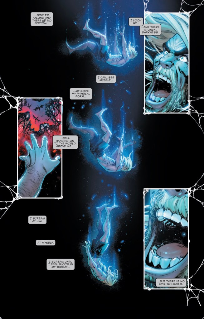 Iban Coello delivers great art that I never get tired of. Its a shame we don’t get any semblance of Eddie as Venom (…sigh…) in this book, because all I ever want is to see this man go for broke drawing our titular character kick ass when he gets the chance to visit this book as the artist, but more often than not, his pencils are rarely used to do a full issue where Eddie, as Venom, is front and center. His Eddie looks good in this book (despite being in only his trunks…or maybe thanks to only being in his trunks?), and his Rex is visually the best take we’ve gotten of the character yet (okay, okay, Rex hasn’t been featured in a lot of stories, but it still counts as a compliment). The two characters show several ranges of expressiveness that I thought Coello did a marvelous job drawing. The limbo they exist in is visualized as New York City as it currently looks during Knull’s takeover, so we get to see the city engulfed in symbiotic biomass and, despite being on a separate plane, Eddie can still witness the terror and panic on the streets, including civilians running for their lives and symbiote-dragons running amok. We only get a glimpse of the ongoing chaos, and I wish we could have seen more. The issue relies heavily on Rex and Eddie assessing their situations; Rex catching Eddie up on his status and Eddie asserting that there must be a way out of their situation.