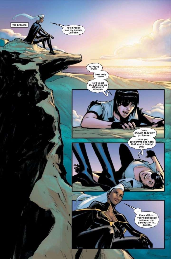 The preview states this issue of MARAUDERS as a rematch… and I beg to differ. It’s not so much a rematch as it is an honorary and noble display by two mutants with the utmost respect for one another. It’s more doing someone a solid than a rematch. However, without spoiling too much, I think this issue was merely set up associated with Storm needing a replacement for herself within the MARAUDERS team. To find the perfect fit, something needs to transpire this issue that will make a ton of sense before the issue concludes. So, if you’ve been reading multiple X-MEN titles, this will have meaning once you read it. However, if for some reason you only read MARAUDERS (which I doubt), this issue will be very confusing.