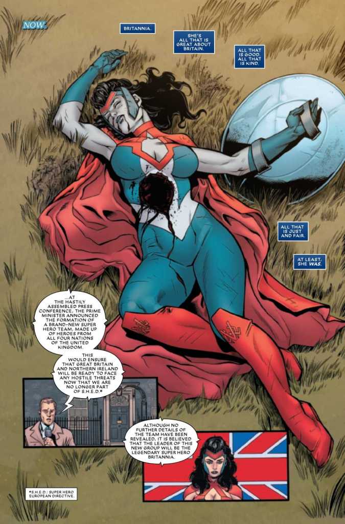 After the battle and ensuring all the nearby civilians are safe, the team tells Union Jack they’re disbanding and going their separate ways. They explain the only joined to follow Brittania’s lead, and now that she’s dead, they have no desire to fight the good fight. Once the team members have gone, the MP explains Union Jack is the new leader per the contract he signed and he has until the end of the month to get the team back together.