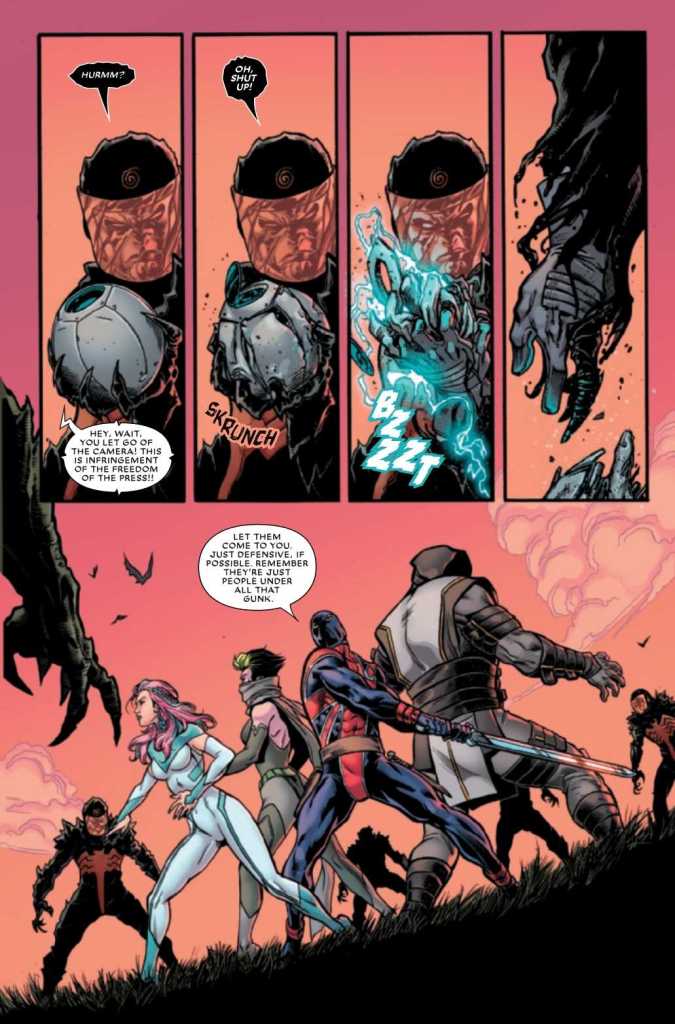 Jack wakes up in pitch darkness, thinking it’s nighttime, but we soon discover (if you’ve been keeping up with King In Black) the world has been engulfed in a giant symbiote goop shield. The team regroups to discover The Choir is gone. Jack asks why he and the others weren’t taken. Kelpie and Snakes surmise they weren’t possessed because their non-human forms are not compatible with symbiote goop, and they didn’t take Jack because he’s just a useless human.