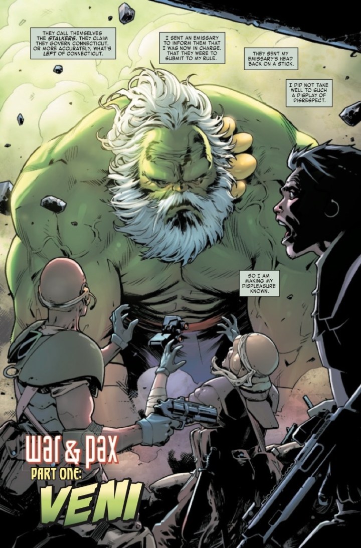 As for MAESTRO: WAR AND PAX, this issue and series are made for INCREDIBLE HULK fans. Now, I’m not going to spoil who makes a guest appearance. However, I will give a hint that many longtime fans will understand. It was Peter David that first introduced this “entity”. And, it was a staple in HULK comics for almost 5 years. Additionally, this “introduction” isn’t in the current Marvel Landscape and fits the supposition of the series perfectly. It’s a Peter David creation that would certainly survive a nuclear destruction adding so many layers to his original FUTURE IMPERFECT story all these years later.