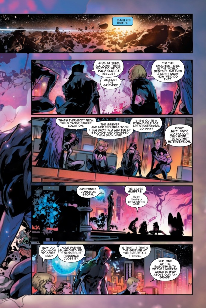 The idea of Silver Surfer teaming up with the Fantastic Four sounds like fun, but believe it or not, after reading this issue, it feels like the FF may have the Superman problem. Is there anything too big for them now? Dan Slott wrote the biggest MacGuffin since “Rosebud” and I’m afraid readers may see it as some sort of genius idea from Slott. Dan has been getting away with writing mediocre endings to the countless stories in Fantastic Four and they go no where. Griever, a being so full of hatred, tortured the Fantastic Four, for who knows how long, just to be talked down from the ledge and gets to push the fast forward button on life? That is what satisfies her? This goddess of destruction should relish in the possibility to destroy everything in her wake. Why would she be so satisfied to see everything end in an instant without her being the cause of it? It makes her character so mediocre, so non-important.