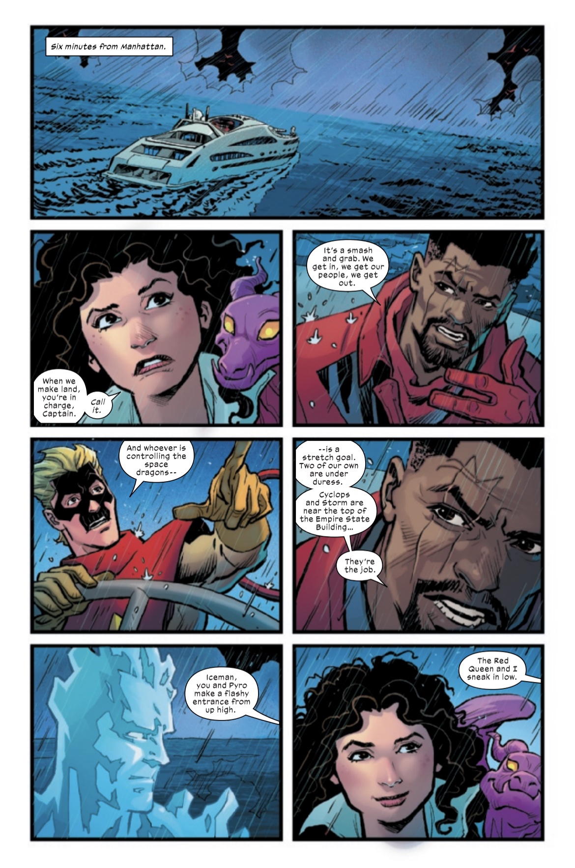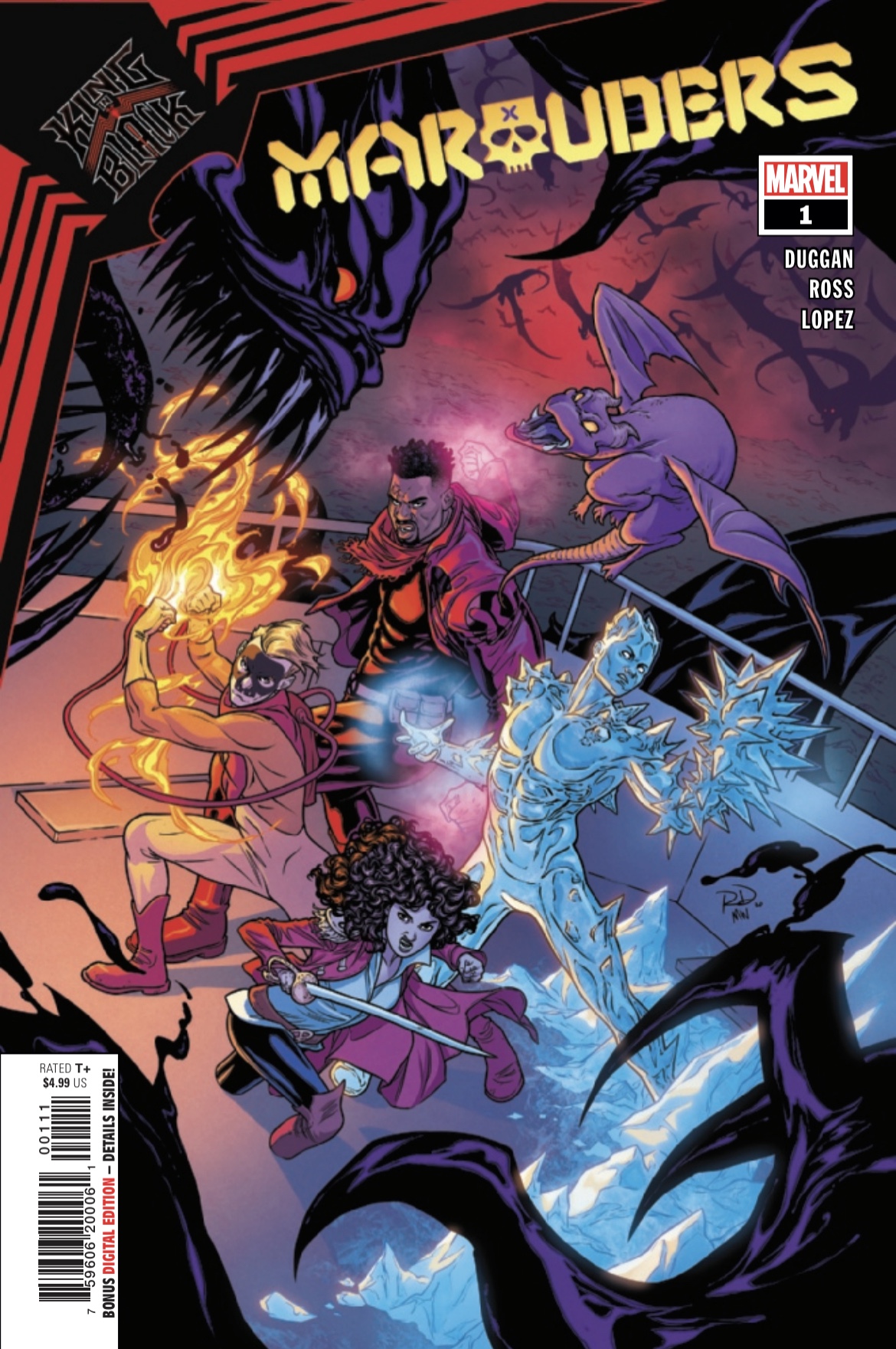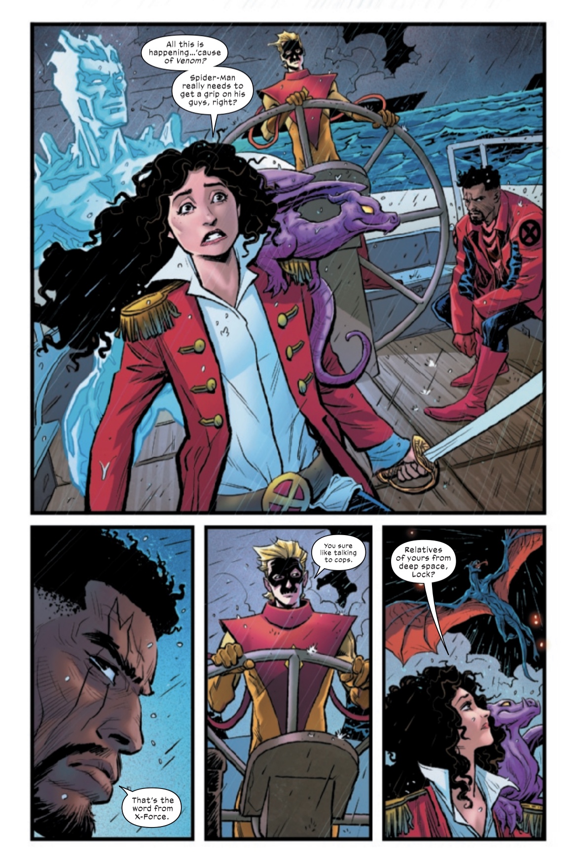 Captain Kate and the MARAUDERS have finally set sail to help Earth battle Knull and his symbiote army. With the planet covered in an oozing dome of black goo, Captain Kate has vowed to protect those in need. However, when a mission to save some of her own goes awry, will the Red Queen be able to save her friends or will she succumb to Knull’s symbiotic nightmare? Let’s set sail on KING IN BLACK: MARAUDERS #1 by Gerry Duggan to see if Captain Kate can calm the Storm… or at least save her.