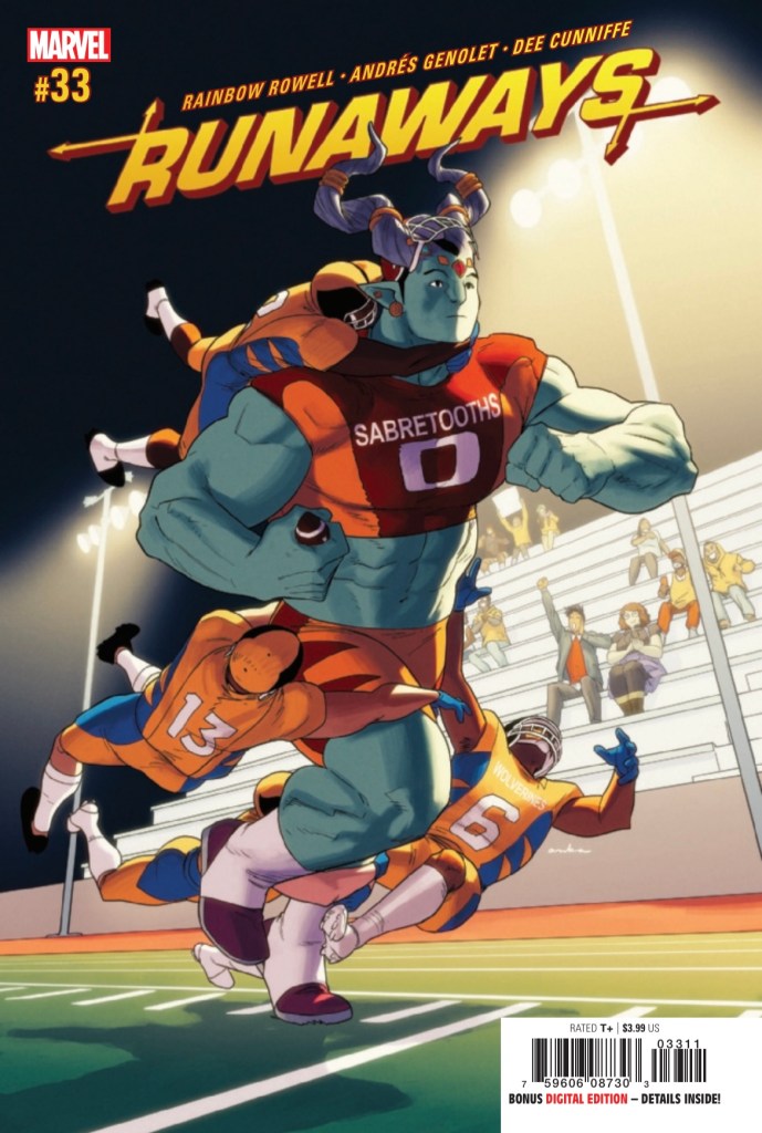 Well, it has been a long time since we got a Runaways issue! And I will admit, I wish we got a page or two of just previously on stuff. Like a full comic page style. I remember Gib and Gert attending school but from the front cover, it seems like maybe we missed an issue. Let’s dive in and see what we have here!