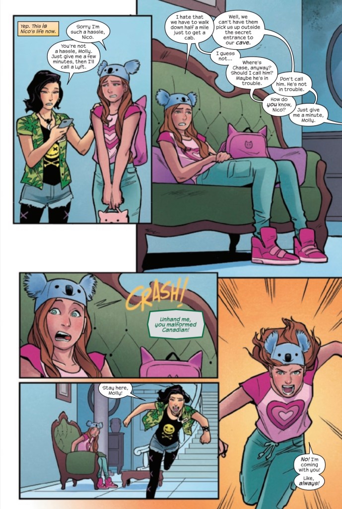 Now we get to the scene of our last in the book and probably the best scene in the book! As Nico finds a way to get Molly to school, we hear a loud noise, and a battle begins. We see Wolverine and Pixie are trying to rescue Molly. Doombot and Nico try to stop their plans. The action in this scene was short but very satisfying.