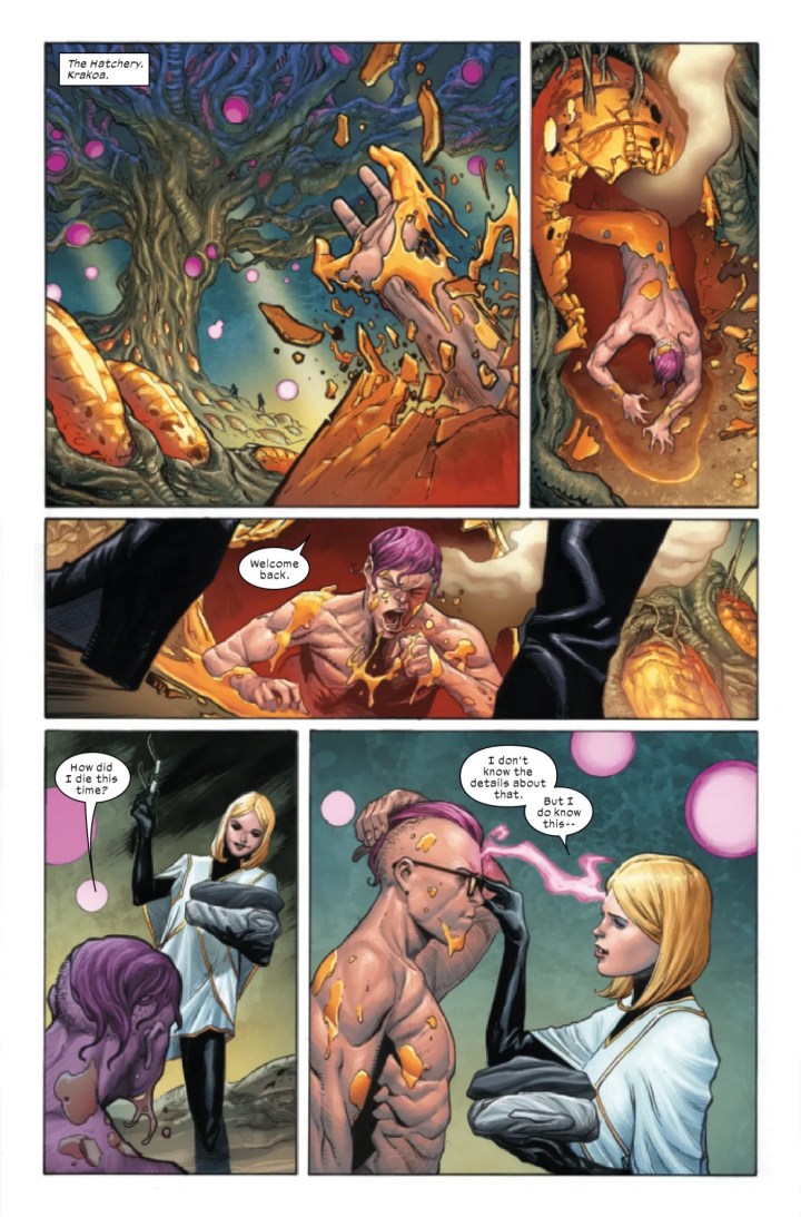 Cassara provides a pretty graphic array of illustrations this week involving the many deaths of Quentin Quire. And, as a fan that loves crisp, detailed renderings with larger panel exploitations, Cassara beautifully delivers. It’s Cassara art that truly reveals the most feeling and passion within the story. The flashback tones, the emotion within Kid Omega’s eyes, and the most minor details between Phoebe and Quentin’s relationship are all portrayed through Cassara’s clear and cloudless design. The best page to describe this entire issue of X-FORCE would be the moment shared by Phoebe and Quentin with a kiss. The unique page layout alone shows the immense skill and affection Cassara has for his work, the characters, and this comic. Simply well done!