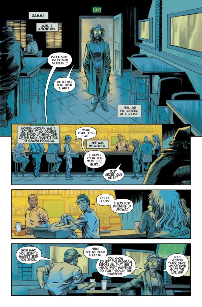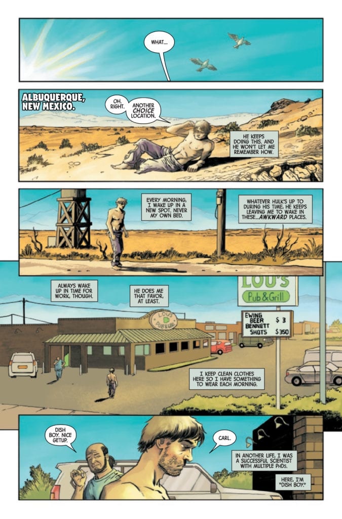 Now, if I may move on to the premise of the issue, Declan Shalvey delivers what could be classified as a prelude to Al Ewing’s IMMORTAL HULK run. Moreover, Shalvey uses this issue to explain some attributes of Bruce Banner as well as the HULK. His focus becomes the tension between the alter egos and the continual death of one Bruce Banner. That’s right… death. Readers, Shalvey isn’t saying Bruce dies every time he transforms. However, what he is saying is that there have been multiple times that Banner has died in the past, which we already know. And, with a little help from his friend, Shalvey uses this issue to show us what happens to Bruce each time death occurs. So, to any fans that have been following IMMORTAL HULK from Day One, you know exactly where that is.
