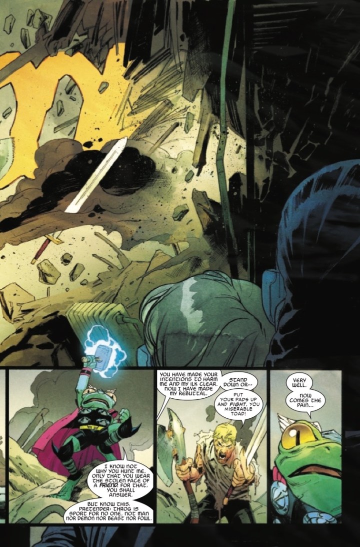 This comic was crazy! From page one to the end, this issue is cluttered with surprises, guest appearances, and insane action that will keep readers on their toes. THROG and LOCKJAW hold their own well and represent the PET AVENGERS masterfully. Frankly, Cates had them do a much better job than BETA RAY BILL or even THOR himself, to be honest. Plus, the entire fight sequence was wonderfully organized by Nic Klein, who was certainly on point this week. All the ironic humor involved throughout the fight between THROG and Donald Blake can be solely credited to Klein’s clever depictions. From frog dissections to fancy dog teleportations and Rainbow bridges, it’s Klein’s atmosphere that makes this comic so fun.