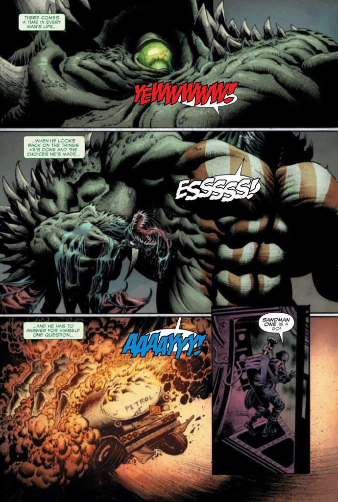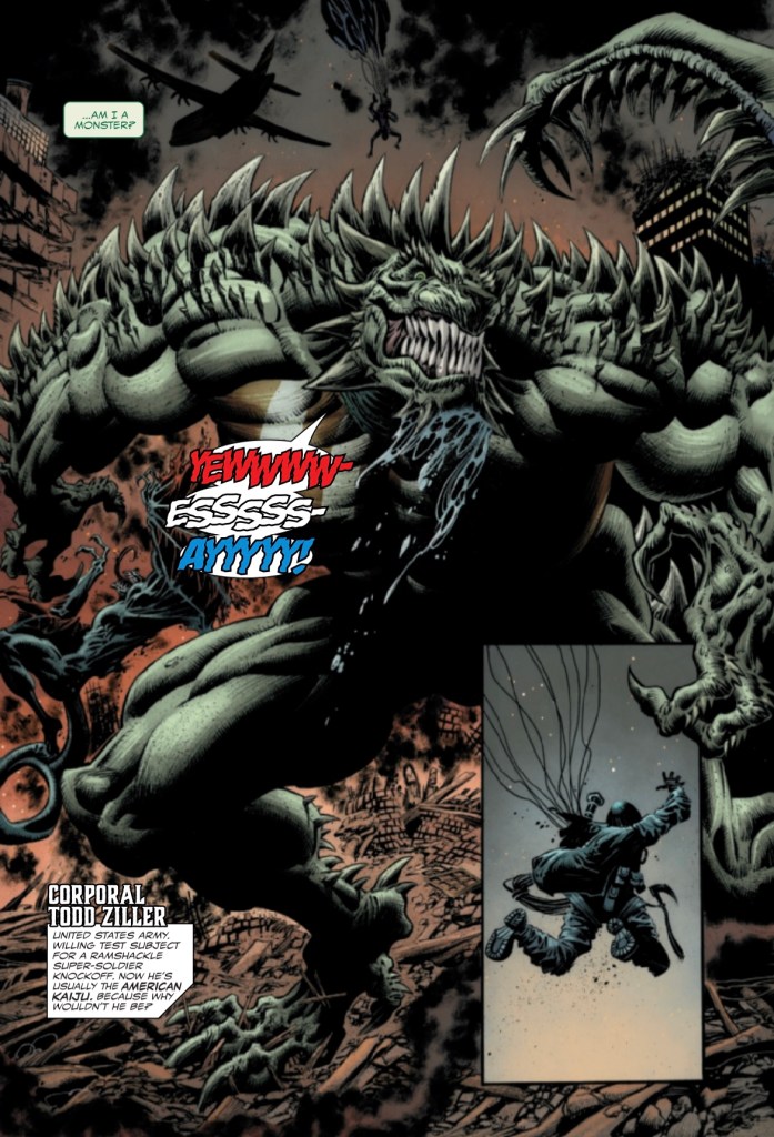 The first story is all about the American Kaiju fighting as many symbiote dragons as he can. That’s…the jist of it, really. The story is narrated by his own inner thoughts, since being a giant rip-off Godzilla doesn’t afford this character much in the way of speaking out loud other than screaming the very cring-inducing “YEWW ESS AYY”…Kyle Hotz gives us some great scenes in this, with the high points being his take on Kaiju from multiple angles. If you were expecting any story or plot here…well, its not really anything substantial. While defending the city from Knull’s dragons, Kaiju ponders whether or not he’s truly a monster, and what it means to be a monster, and if his actions make him more a monster than a hero, etc. The narration here reads like its just talking in circles, as it ultimately ends by getting us back to the first question, and Kaiju is no more closer to figuring that out since the first page.