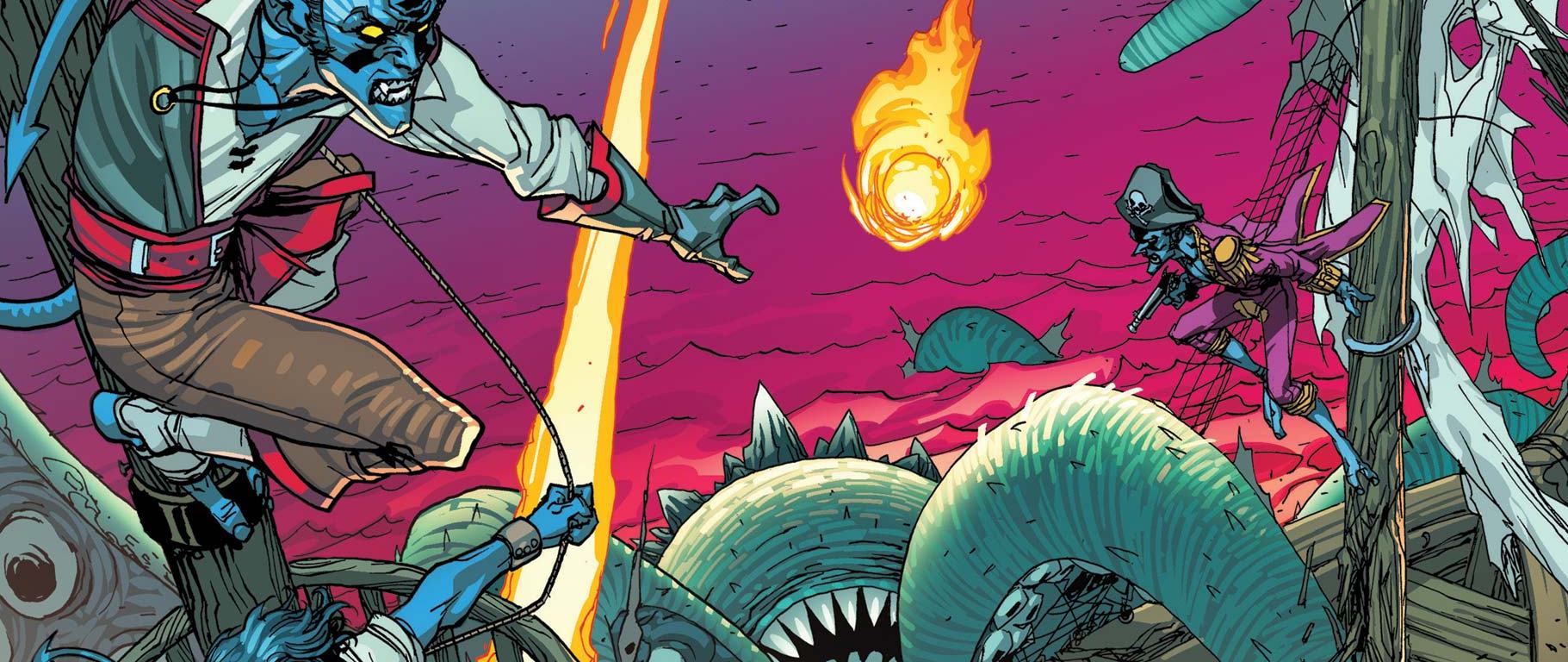 We pick up where we left off with issue #1 as Nightcrawler encounters Legion in a cemetery. Nightcrawler is looking for answers but Legion is only interested in self-serving solutions. Legion invades Nightcrawlers mind, which looks like a pirate ship populated by assorted, swashbuckling version of Nightcrawler and removes a tainted “coin” attached to the ship. It’s unclear what the coin actually does except it doesn’t belong there and it was placed in Nightcrawlers mind to do something. Track him? Confuse him? Who knows.