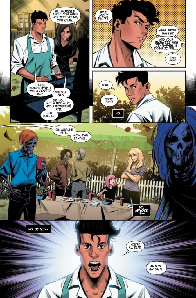 Now, Moon Knight finds himself in a disorienting-yet-idyllic version of his life before figuring out he’s trapped in a dream by Morpheus. What follows is a series of scenes wherein Moon Knight hops from his own dreams to the dreams of others until he reaches a final, fateful confrontation with Morpheus.