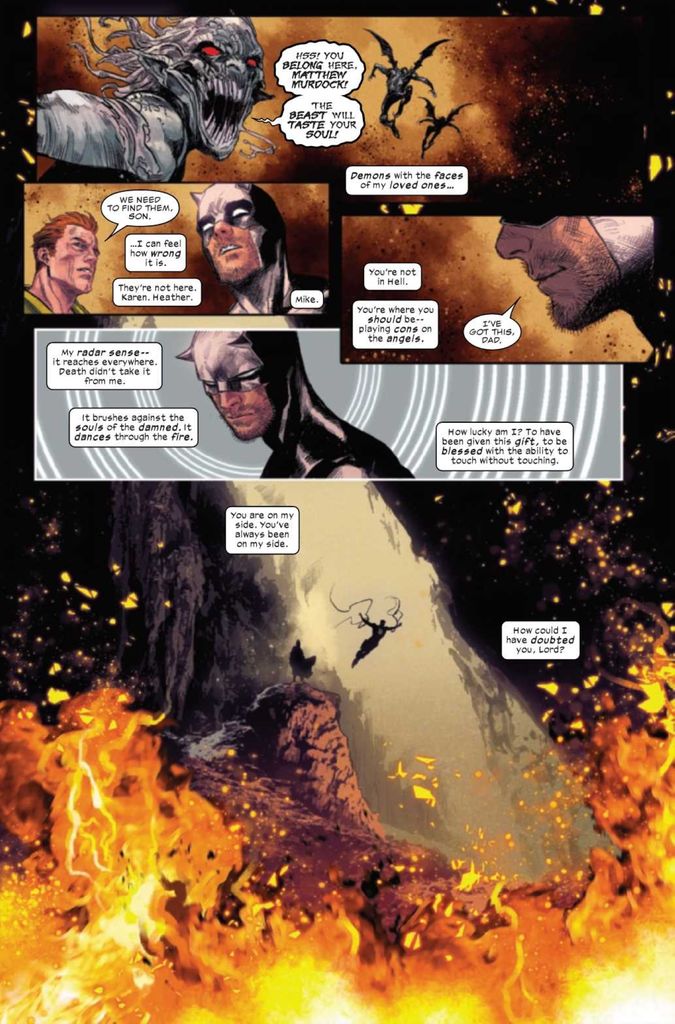 When last we left Daredevil, he tricked Elektra into killing him near the portal to Hell so his soul could enter the Beast’s domain in a bid to rescue the imprisoned souls of his family and friends. Now, Matt endures illusions and demons to reach his final destination, but a shocking revelation threatens to overwhelm Matt’s faith one last time.
