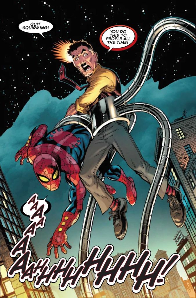 When last we left Spider-Man and J. Jonah, they narrowly escaped an upgraded Dock Ock with the help of Doc’s former harness-turned-sentient-pet (?). Doc Ock got away with Norman Osborn, and Spidey was left at the mercy of his new allies for refuge and help. Now, Doc Ock searches Norman’s mind and corporate records to destroy anything to make Norman suffer, while Doc’s old harness urges Spidey to “bond” with it to help find Doc Ock and rescue Norman.