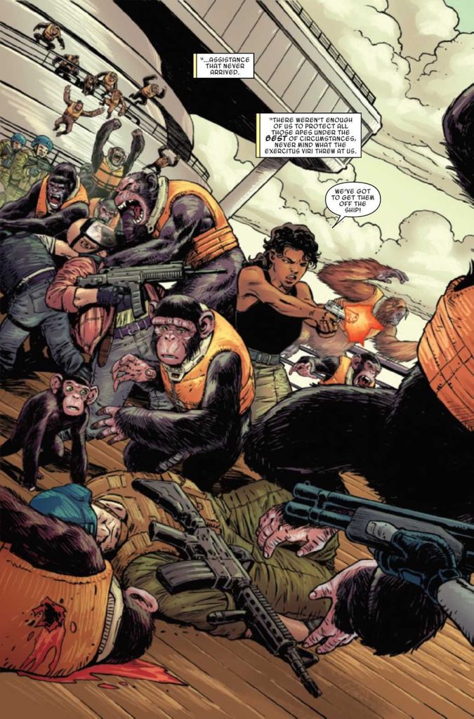 Planet of the Apes #4 finds Juliana Tobon and her ship of apes besieged by the Exercitus Viri in the first recorded battle where apes were used as the primary defenders.