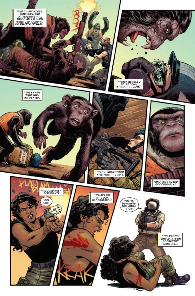 However, the moment feels fabricated because it requires a suspension of disbelief too heavy to bear. How did a ragtag group of terrorists get the people, training, resources, and weapons to stage a global, coordinated attack against every major ape refuge across the planet? How did a loose network of terrorists assemble enough power to attack major cities with enough force to overwhelm in-place military and civilian militia? It’s a bridge too far, presumably because Walker began this series as an incredibly heavy-handed allegory for the COVID-19 pandemic and the worst traits of humanity coming out of that event. Does Walker believe that, had the COVID lockdowns continued, the anti-government and anti-vax sentiment would have coalesced into some kind of terrorist organization? Who knows, but it sure feels like Walker is trying to vent a message to the detriment of the story at hand.
