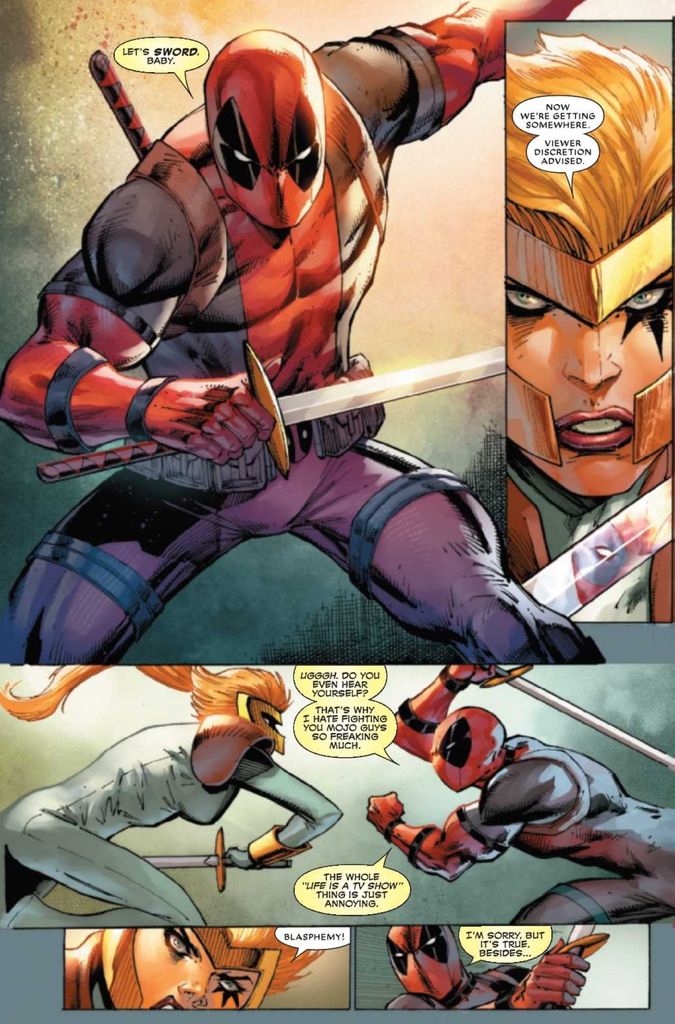 When last we left Deadpool, he found Thumper and attempted to take him into custody to save him from himself when a woman suddenly appeared who looks a lot like Shatterstar. Now, we find out the woman calls herself Shatterstrorm as an homage to her hero, but she kills for money because swords are pricey. As a denizen of Mojoworld, Shatterstorm has been sent to take Deadpool out… but something ain’t right.