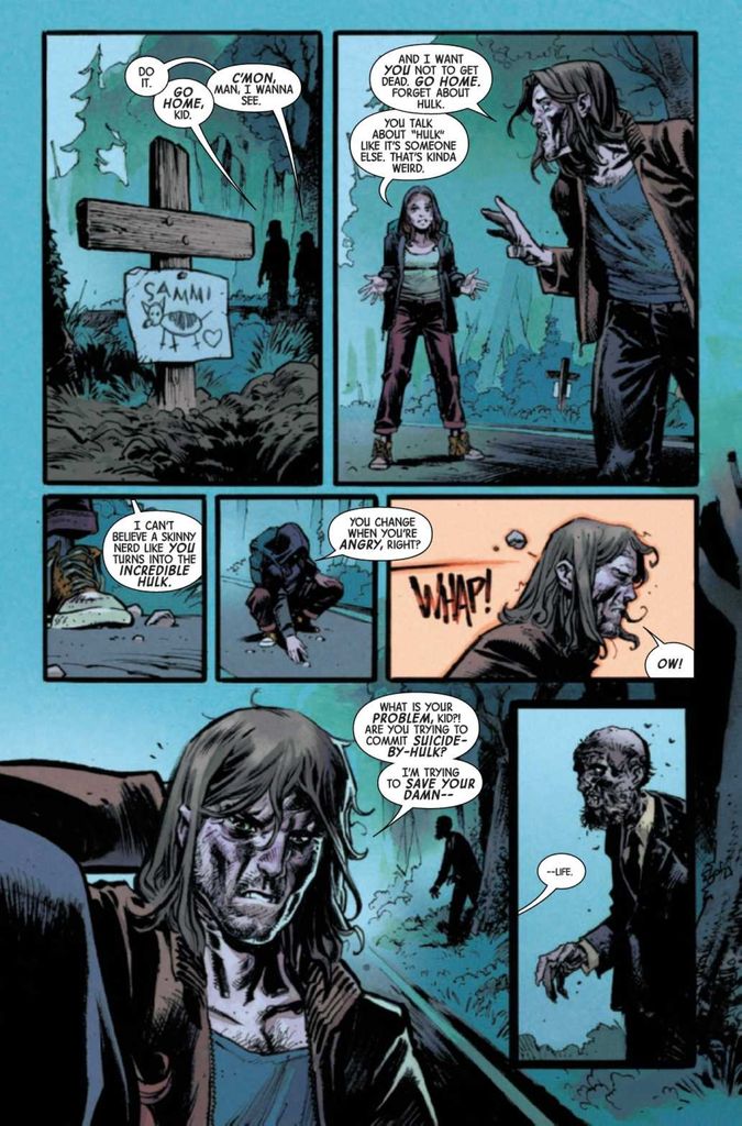 When last we left the Hulk, we got a renewed view of Bruce Banner’s life on the road as a drifter intent on staying away from humans as much as possible now that the Hulk is actively fighting to take permanent control. The Eldest, learning that the Mother of Horrors has manifested inside the Hulk, sent out a summoning call to all the monsters of the world to find the Hulk and unleash Mother. Now, Charlie, the abused girl we met in issue #1, insists on tagging along out of kinship and a need for protection while the latest monster, Brother Deep, resurrects his undead congregation in service to the monstrous god at the heart of the nearby town’s abandoned coal mine.