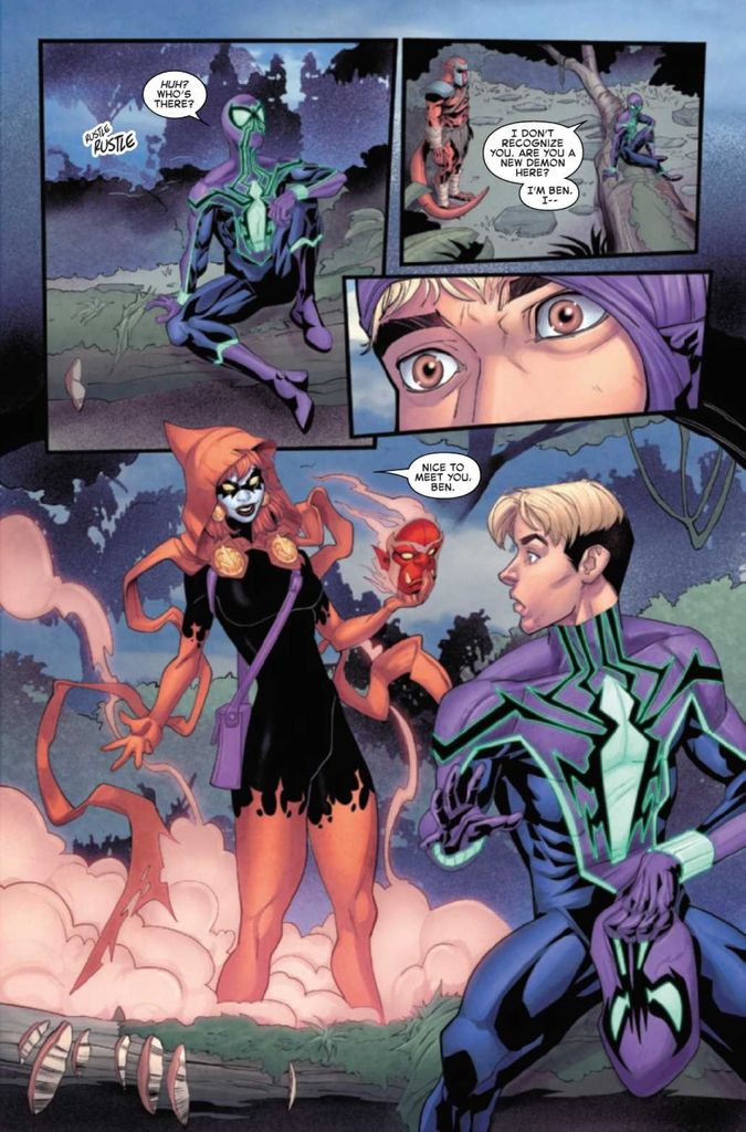 The demon signals fellow demons for help, pitting Spider-Man against a small group of demons while the first demon sneaks off into the bowels of the embassy. Surprise! The first demon is Hallows’ Eve in disguise. She created the distraction to keep guards occupied while she breaks into the embassy prison to rescue Ben Reilly. The two escape Ben’s jail, only to be captured when Queen Goblin s interrupted by the noise and casts a spell to put everyone back where they belong.