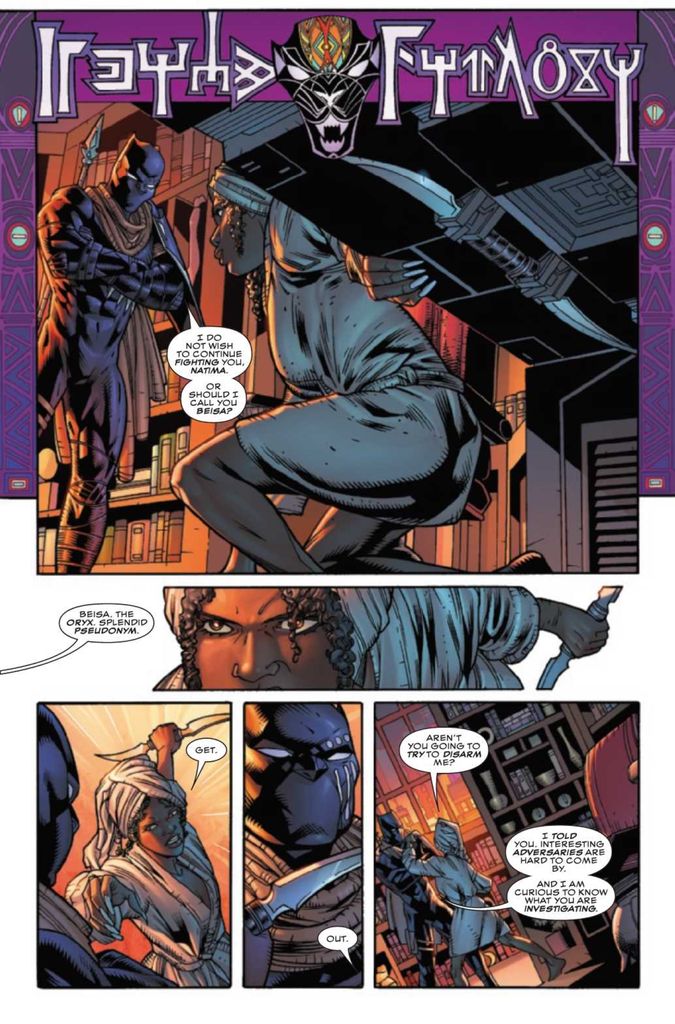 When last we left T’Challa, he found himself confronted by a masked thief who dressed like a Beisa (a white onyx) as her crime costume of choice. Beisa broke into T’Challa’s friend’s home, so T’Challa decided to track Beisa down and return the favor.