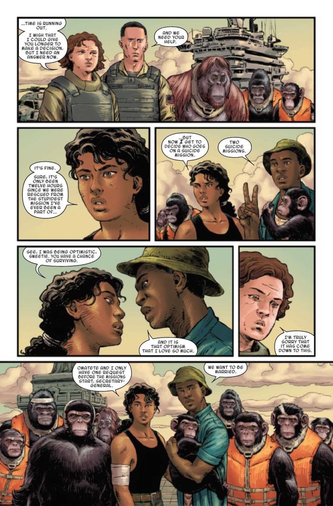 Planet Of The Apes #5 brings Marvel’s adaptation to a close as Juliana and Omatete split up to lead one group of apes to the CDC in Atlanta while the other takes up arms to fight to save Washington D.C.