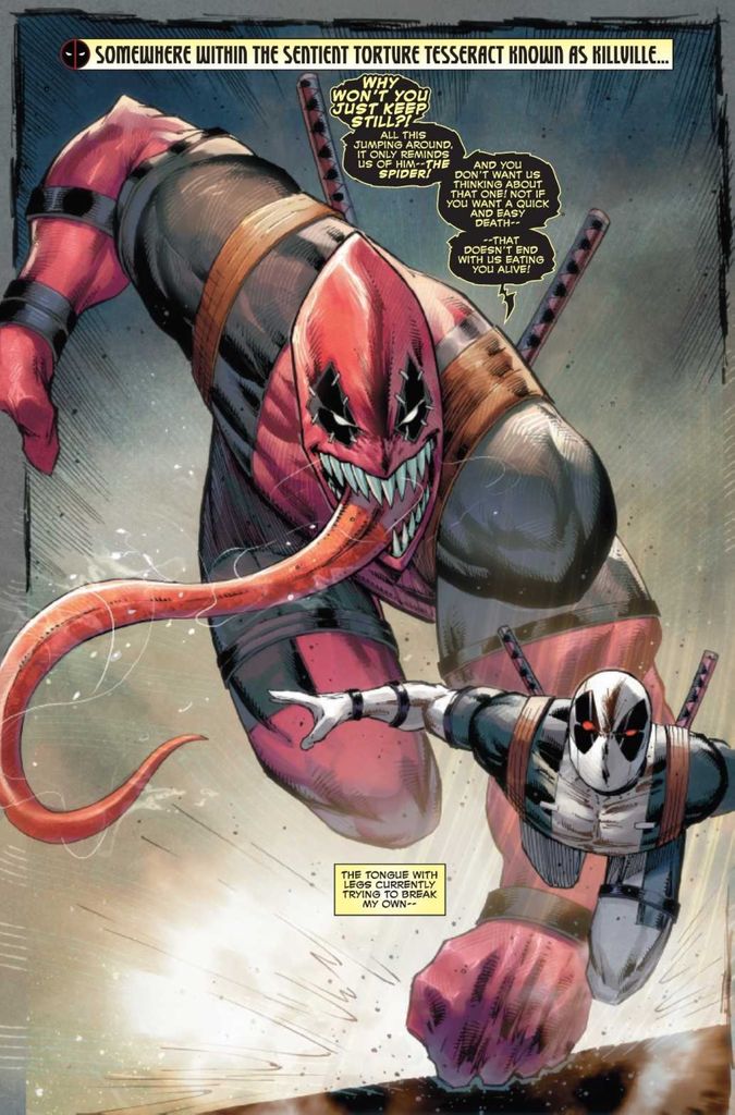 When last we left Deadpool in issue #3, he suddenly (inexplicably) found himself in a simulation fighting against an assortment of past enemies. The simulation was created by a VR/reality-warping entity called Killville in partnership with Arcata for the purposes of testing an upgraded alternative to Arcade and Murderworld. Now, Deadpool faces off against a real or imagined Venompool, a real or Imagined Guardian, and meets with a real or imagined Deadpool Corps and Wolverine.
