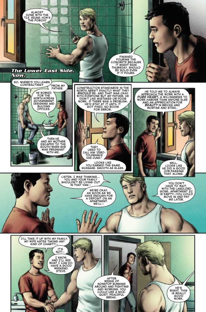 What’s not so great about Captain America #2? Steve’s present-day thread is, to be blunt, dull. We get it. He’s appreciated but overworked. That’s not much to hang on to in terms of capturing reader interest, so it would help if present-day Cap had something more to do than tile a shower or go on a stakeout that turns into a dud.