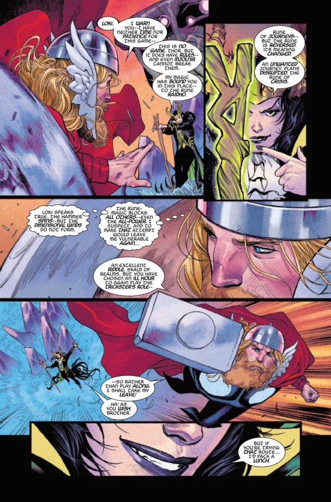 What’s great about Immortal Thor #3? In tone, style, and outcome, this issue does indeed feel like you’re reading a centuries-old tale about Thor the Wise or Thor the Clever as he attempts to outsmart his trickster god of a brother. If you like reading Epic poems, this issue is right up your alley.