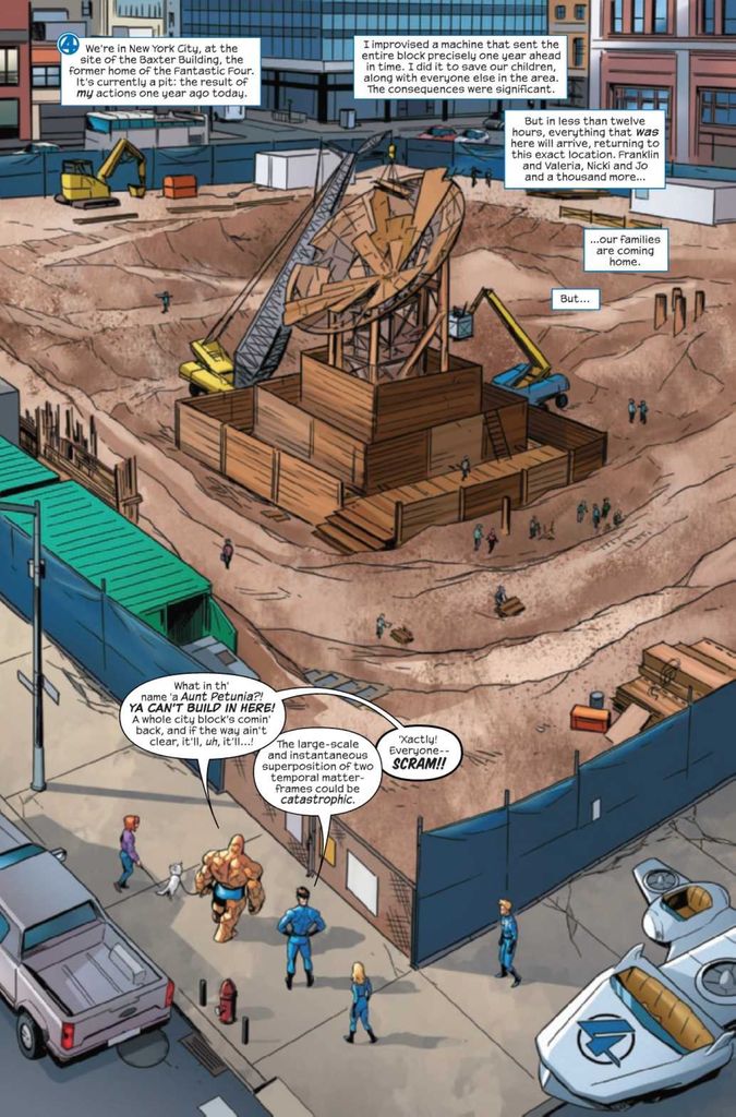 When last we left the Fantastic Four, they teamed up with their dino counterparts from an alternate dimension to stop Dr. Doom and Dino-Dr. Doom from merging their Earths together. Now, the FF returns to where it all started at the sight of the time-displaced Baxter Building, where they find a gaggle of citizens and supervillains building what looks like a transmitter on the empty lot where the Baxter Building is due to appear in a few hours.