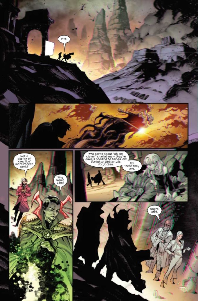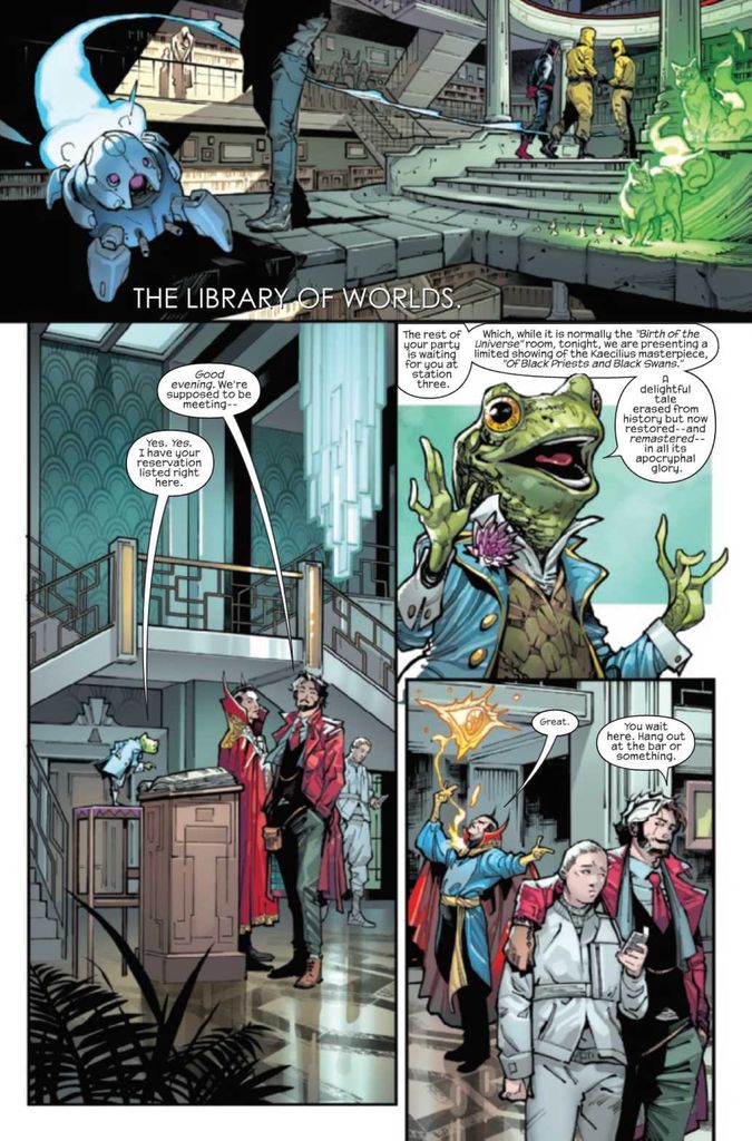 Now, Wyn and Doctor Strange arrange a meeting at The Library Of Worlds with Dr. Cercle and Aiko to discuss his findings and possibly form a joint operation to do… something. Meanwhile, Dimitri and Mia get acquainted when the god Oblivion enters the Library to do… something. Simultaneously, Amanda, who is the next in a long line of Cassandras, breaks into the Library and kills a man holding a small object, also called Oblivion, because the object will do… something.