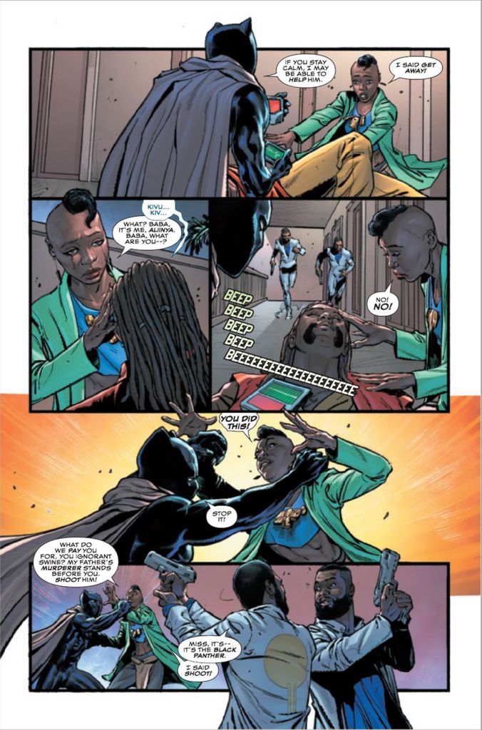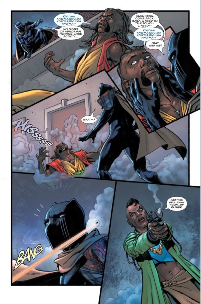 When last we left Black Panther, readers learned the rich, detailed history behind the supernatural force known as Kivu’Ma and how it began as a Wakandan citizen who turned to dark magic through a lust for power. That dark magic eventually consumed him. Now, Kivu’Ma continues to exert its influence by killing Baba Nkisu, leading Baba’s daughter Aliiya to believe that Black Panther killed her father. Out of leads and options, T’Challa turns to N’Yobi for advice on how to proceed. In return, N’Yobi suggests taking in the sights and the people to see if an opportunity presents itself, and it does.