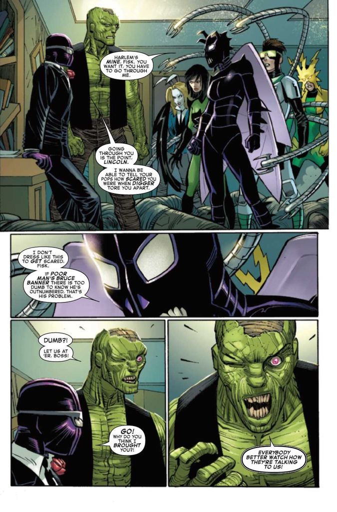Wilson Fisk shows up with Typhoid Mary and a squad of Hellfire goons to confront Tombstone, Spider-Man, and She-Hulk to ensure they don’t interfere with his son’s fight. Fisticuffs ensue on two fronts. The Rose and his muscle, Digger, fight Beetle and her female version of the Sinister Six. Meanwhile, Tombstone goes mano-a-mano against Fisk while Spidey and She-Hulk fight Typhoid Mary and the Hellfire goons.