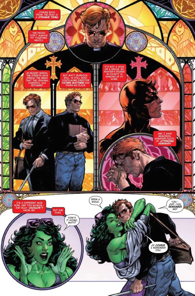 Daredevil #5 spends he day on a food crawl when Father Matt runs into a She-Hulk, and the two decide to grab a bite… or three… or eleven.