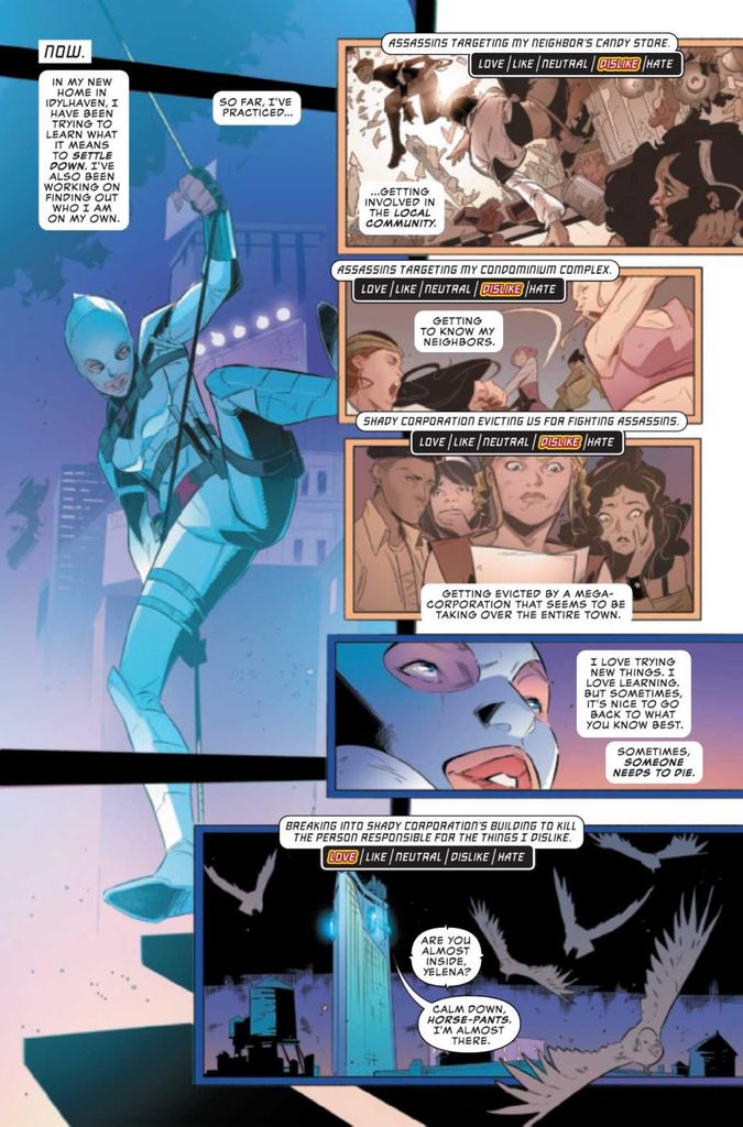 White Widow #3 finds Yelena Belova protecting one of her neighbors from an assassination attack only to learn the entire town of Idylhaven has been turned into an assassin training ground by Armament.