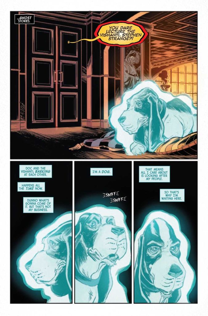 What’s great about Doctor Strange #12? The highlight of the issue is Beyruth’s art. Bats gets plenty of panel time to sniff, float, converse, and investigate the Sanctum in all his lovable, ghostly glory. If you’re a fan of Bats the Ghost Dog, this issue is dedicated to you.