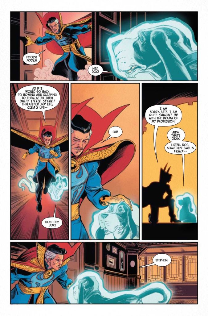 Doctor Strange #12 brings Bats to the forefront when the ghostly hound catches a whiff of something that doesn’t belong in the Sanctum Sanctorum.