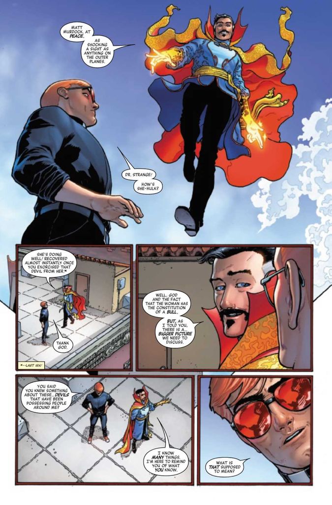 When last we left Daredevil, Matt spent a day on the town on a seriocomic food tour with She-Hulk before he figured out that Jennifer was infected with Gluttony. After a brief tussle and a few prayers of exorcism, all is right with the world.