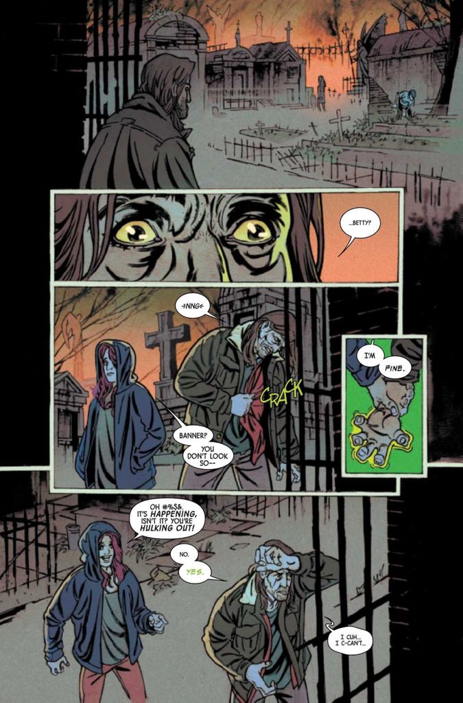 Now, Banner and Charlie relocate from the American Southwest to New Orleans for no particular reason whatsoever. Banner feels the urge to Hulk out in the middle of a nightly visit to a museum. Fearing for Charlie’s safety, Banner begs her to meet him later at a hostel so he can deal with his Hulk-out alone. After Charlie leaves, Banner is approached by Betty to convince Banner to reconsider the Eldest’s offer to give over the Hulk persona.