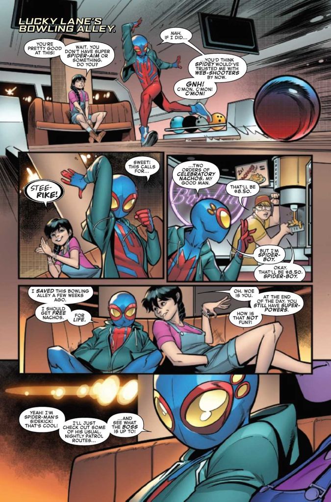 In Spider-Boy #4, Bailey impetuously pops up during Spider-Man fights to be part of the team, but Spider-Man handles a skirmish against the Vulturions easily with Miles Morales by his side. Feeling untrusted and unwanted, Bailey call it a night. Soon, a more monstrous version of Spider-Boy disrupts a movie theater and bowling alley and accosts Miles Morales. When Spider-Man arrives at FEAST to give Bailey a pep talk, Bailey gets a psychic vision about the attack, so they head off to facedown Bailey’s monstrous doppelganger.