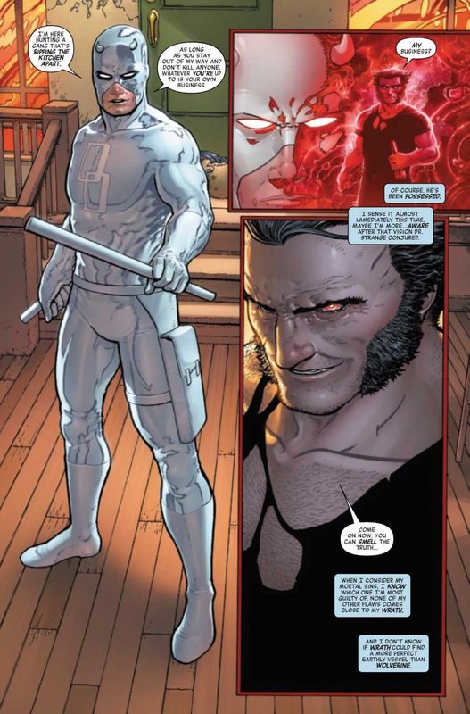 When last we left Matt Murdock, he went on a brief trip to the Afterlife to find the answer to his present possession predicament, only to learn that the Seven Deadly Sins are a side effect of Matt’s return from the dead, a resurrection event that has still not yet been given an explanation. Accepting his responsibility and duty to take out the demonic trash, we end the issue with Daredevil in his white suit crossing paths with Wolverine.