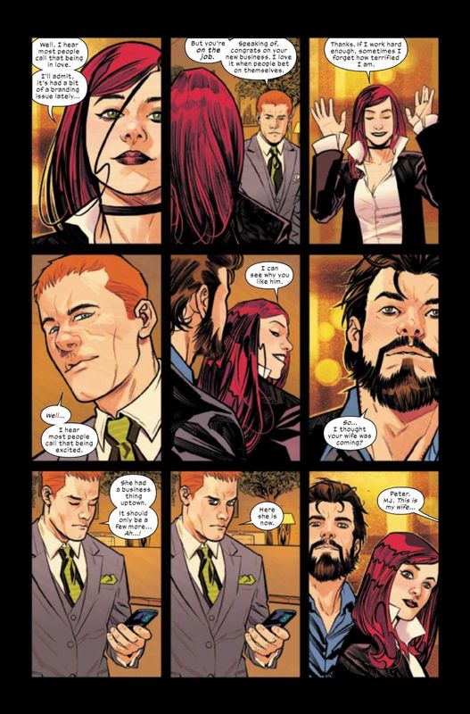 Now, Peter and MJ agree to meet Harry and his wife, Gwen Stacy, for dinner to get acquainted while Uncle Ben and J. Jonah watch the Parker kids. We learn Gwen knows about Harry’s secret identity, MJ started a PR firm, and that’s about it.