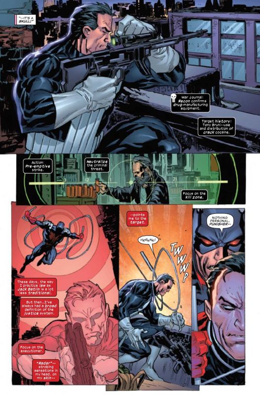 Black Armor Daredevil intercepts Punisher before the latter kills a would-be drug manufacturer running a mill out of an old warehouse. However, it turns out the dealer is reformed, and he’s putting his talents to good use making diabetes medication for the uninsured. When DD and Punisher clear up their differences, a drug gang pulls up to make a withdrawal.