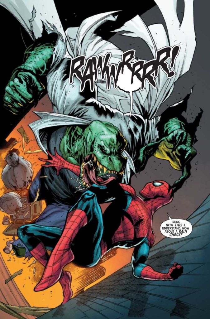 Further, there’s an odd sticking point that doesn’t make a lot of sense. Zeb Wells made a big deal of teaching Spider-Man a lesson in ASM #49 that vampires are people, too, and that cutting loose on bloodsuckers is not the best approach. Here, that point is hammered home on the preface page, but as the unlikely trio makes their way through the city, Misty has no qualms about shooting vampires through the head and Lizard literally rips vamps apart. What was the point of projecting that moral message if it’s simply going to be ignored in the next issue?