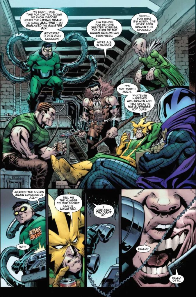 In Amazing Spider-Man #51, we catch up with the Sinister Six scheming to break into Oscorp and take revenge on the Living Brain for past wrongs. During the meeting, they receive an unexpected call from Norman Osborn. After a mild amount of posturing, Norman informs the group that he’s sent someone to kill them – Spider-Goblin.
