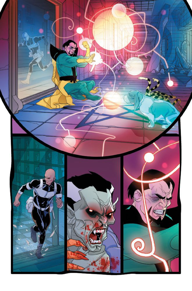 When last we left the Sanctum Sanctorum in Doctor Strange #16, Wong held vigil over Stephen Strange’s body as it was encased in a magical prison. Strange had no choice but to spiritually leave his body after Blade turned him into a vampire. Sensing an opportunity, Victor Strange took possession of his brother’s body and began to chase Wong through the Sanctum Sanctorum in the first of this two-part Blood Hunt tie-in.