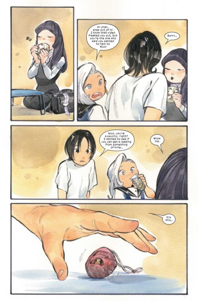 The story moves to Hisako’s room where she and Mei have invited Nico to help them with her psychic powers to figure out what’s happening. Hisako offers her omamori, hoping Nico can sense where it came from and who gave it to her. Nico focuses on the totem to divine its origins. Suddenly, a Shadow emerges from the omamori. Nico splats the Shadow with her book, but the Shadow tries to push its way free. Nico instinctively grabs her magnifying glass, which turns into a large staff from her Earth-616 Runaways ensemble and disperses the Shadow permanently.