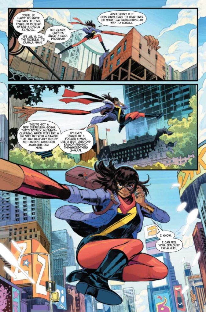 Lanzing and Kelly’s disappointing tale begins with Kamala Khan, aka Ms. Marvel, embiggening her way across the George Washington Bridge from Jersey City to NYC in full view of thousands of people. She wears her traditional Ms. Marvel outfit (not the X-Men upgraded version she received during the Fall of Krakoa) and a winter coat that appears to change size on every panel. After the Krakoan era, mutants are outlaws and Kamala just wants to get back to normal college life… by enrolling in a class about Krakoan history taught by a mutant, Prodigy.