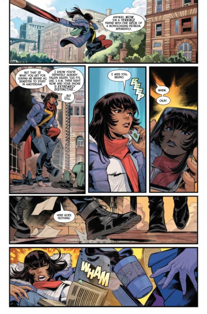 Oy! We’re only a few pages in, and I already want to throw this comic across the room due to the sheer number of inconsistencies and logical flaws. Why are the mutants considered outlaws, and yet, they still operate and work in full view of the public? Why is Kamala concerned about maintaining her secret identity when she’s running around doing hero things, wearing a domino mask that wouldn’t fool a toddler? Why does Kamala’s winter coat keep changing size to match her embiggening? Why is she wearing the same winter coat and scarf when she gets to school as a civilian if she doesn’t want to be recognized? Is it bad art or a bad script? I don’t know, and I don’t care.