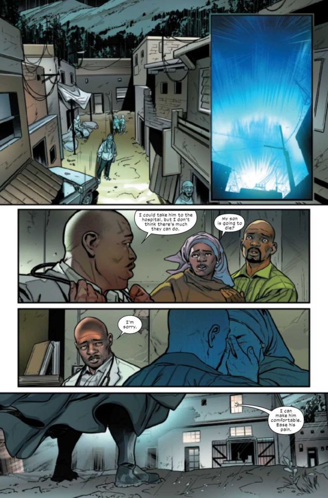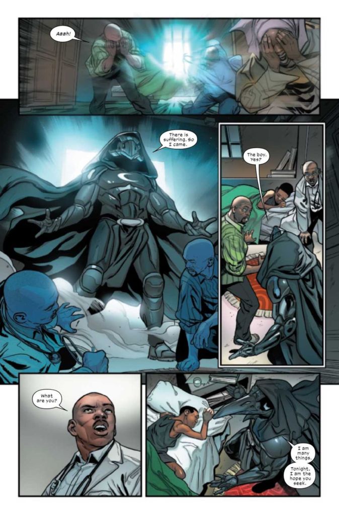 In Ultimate Black Panther #6, Moon Knight (The team of Khonshu and Ra. Yes, it’s needlessly complicated naming. Stop pestering me about that.) steps up their attacks on Wakanda with a new approach. Khonshu appears in his full regalia to heal people and perform “miracles” to convert ordinary African citizens into zealous acolytes. What’s the plan? To build a devoted army to invade Wakanda with overwhelming numbers of African-styled jihadists.