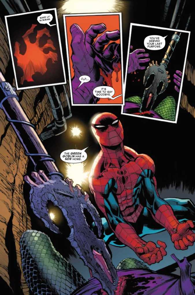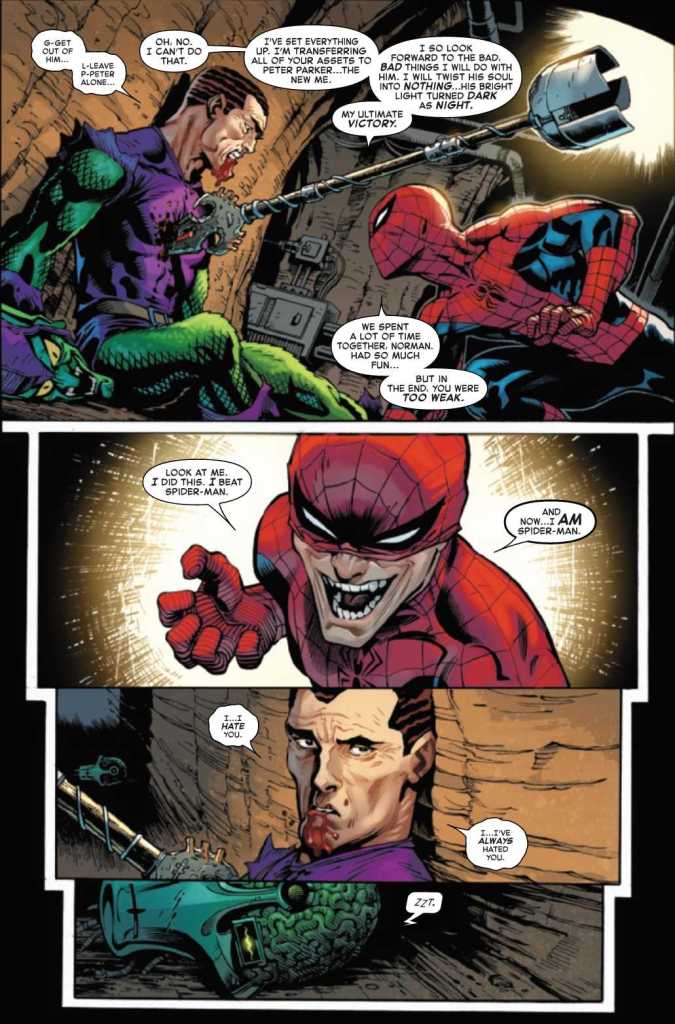 Well, which is it, Zeb Wells? Do you need the spear to pull the Goblin programming out or not? In one panel, Norman pulls the programming out of Peter by stabbing him with the “soul spear,” trapping it in the spear. In another panel, he slashes Peter in the chest, and the goblin programming magically leaps out of Peter and into Norman. In another panel, the goblin programming leaps from Norman to Peter simply by the two characters screaming at each other. It’s one thing to break the rules a creator established after several issues or after handing the title off to another writer. It’s another thing to break whatever rules have been established between successive panels.
