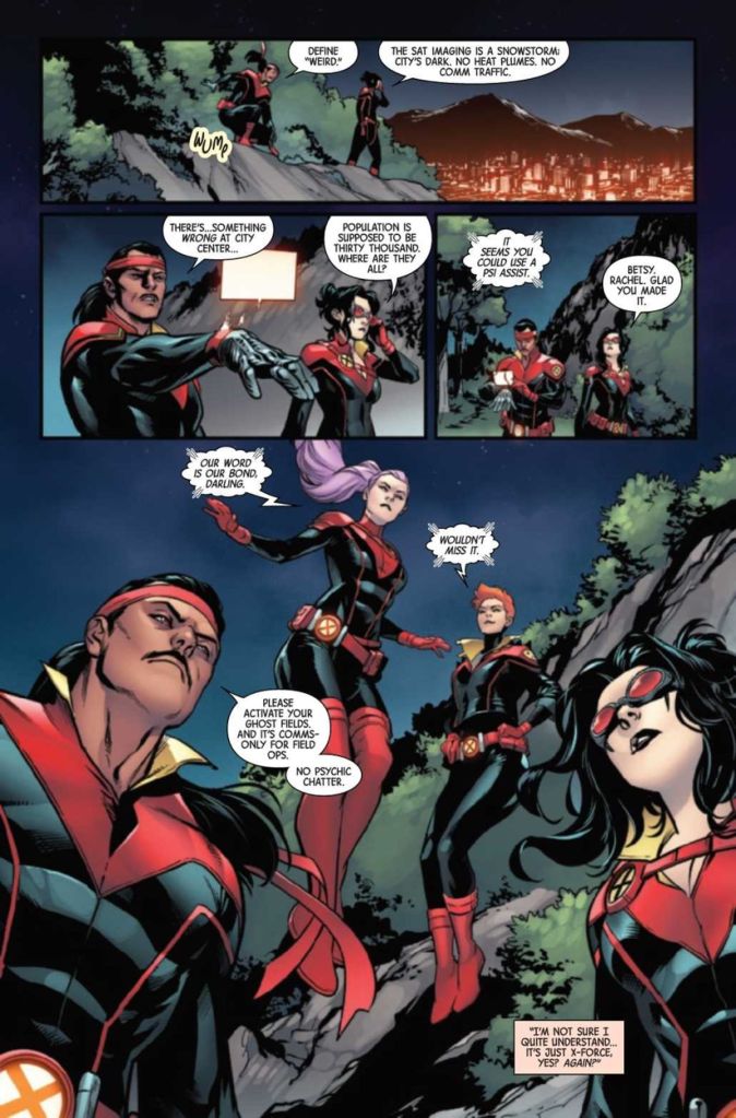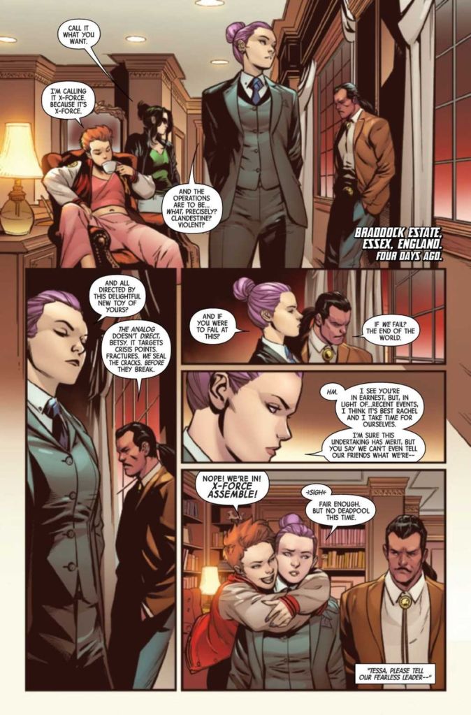 Second, the formation of the team happens without rhyme, reason, or setup for what the characters have been up to since we last saw them. How did Sage wind up in a hospital in Switzerland, and why was she in a semi-psychotic state? If you’ve been following Krakoa in total, you might know the answer, but readers will have no idea what’s happening, so this first issue has more than its fair share of clunkiness.